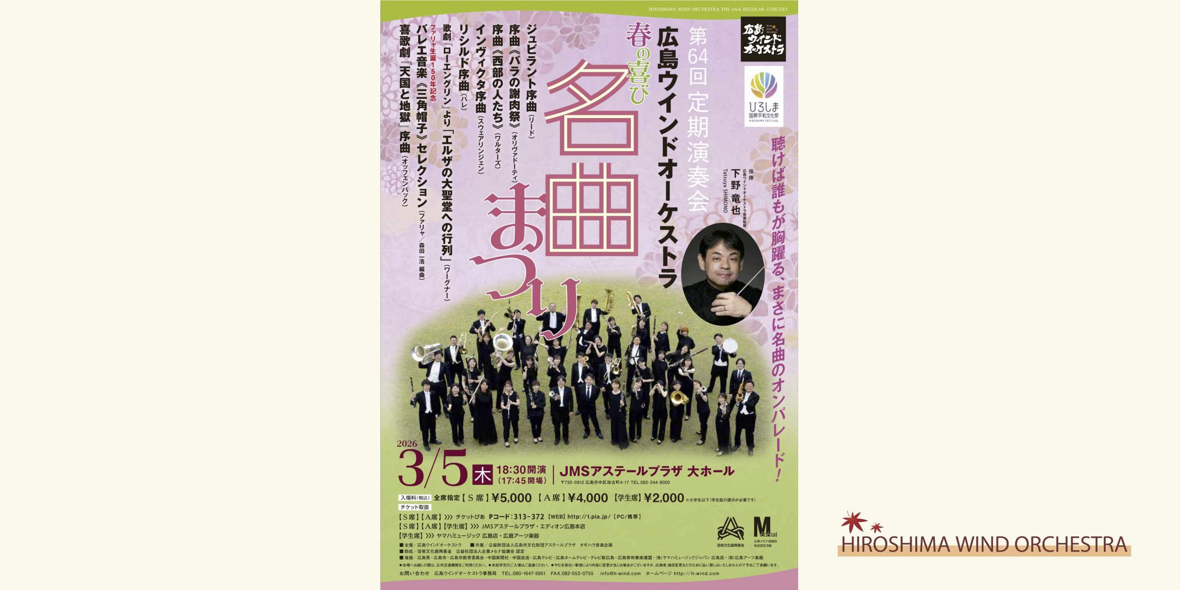 [プログラム] 【春の名曲まつり-日本のファンタジー】 櫛田胅之扶:飛鳥(1994年改訂版) 大栗 裕:大阪俗謡による幻想曲 F.ショパン(藤田玄播編曲):幻想即興曲より F.リスト(田村文生編曲):バッハの名による幻想曲とフーガ 和田 薫:「ゴジラ」ファンタジー 天野正道:「GR 」より シンフォニック・セレクション